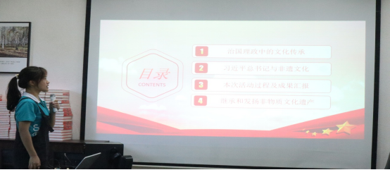 庞彩霞三人学生小组则作了“2022暑期三下乡‘雷厉风行剧神队’之雷剧英译”项目汇报。 队员们从《习近平谈治国理政》中关于文化传承以及习近平总书记关于非遗文化的相关论述出发,回顾了暑期的活动并总结了实践的成果。队员们表示将坚持继承和发扬非物质文化遗产,坚定民族文化自信。