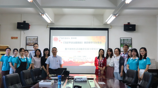 为深入学习习近平新时代中国特色社会主义思想,深入领会《习近平谈治国理政》第四卷的重要精神,2022年10月11日下午,外文学院翻译研究所在学院会议室举办了广金外语论坛第50期之《习近平谈治国理政》第四卷学习分享会暨中国特色话语翻译实践与研究沙龙。