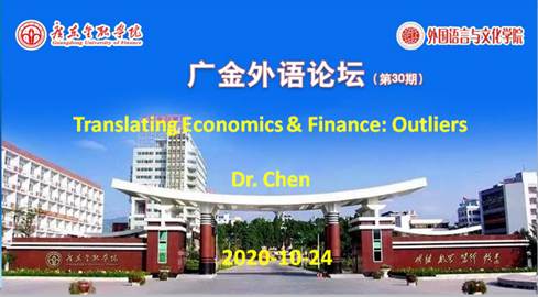 2020年10月24日,翻译系陈定刚博士主讲第30期广金外语论坛,在线上为大家带来了一次关于经济与金融翻译的讲座,会议由外文学院洪溪珧博士主持,包括广东省高级人民法院外事办主任屈伸和外文学院黄中习院长在内的近百名位翻译工作者和师生聆听了陈博士内容丰富的专业讲座。