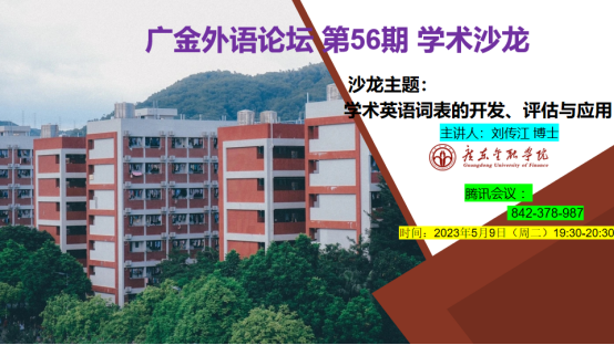 2023年5月9日星期二晚上,广东金融学院第56期广金外语论坛在线上以腾讯会议的方式举行。此次外语论坛的主题是:“学术英语词表的开发、评估与应用”。论坛邀请了我院大学英语一部主任刘传江博士为我院教师介绍有关学术英语词表的研究和应用。