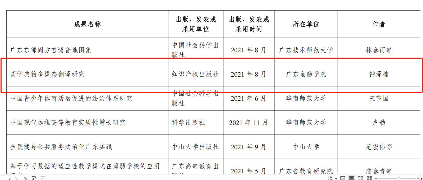 近日,由广东省哲学社会科学规划领导小组批准,广东省哲学社会科学优秀成果评奖工作办公室组织的第十届广东省哲学社会科学优秀成果奖评选公示结果。我校国产欧美日韩在线观看钟泽楠老师的专著《国学典籍多模态翻译研究》荣获著作类成果三等奖。