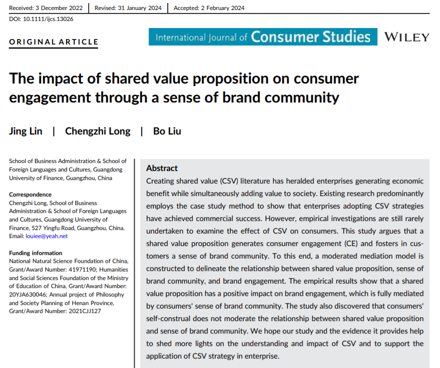 林菁老师的文章题为“The impact of shared value proposition on consumer engagement through a sense of brand community”,通过实证研究深入探讨了企业共享价值主张如何通过增强消费者对品牌社区的感知,进而影响消费者参与水平。这一发现不仅丰富了品牌管理和消费者行为的研究领域,更为企业在制定共享价值战略时提供了宝贵的理论支持和实践指导。