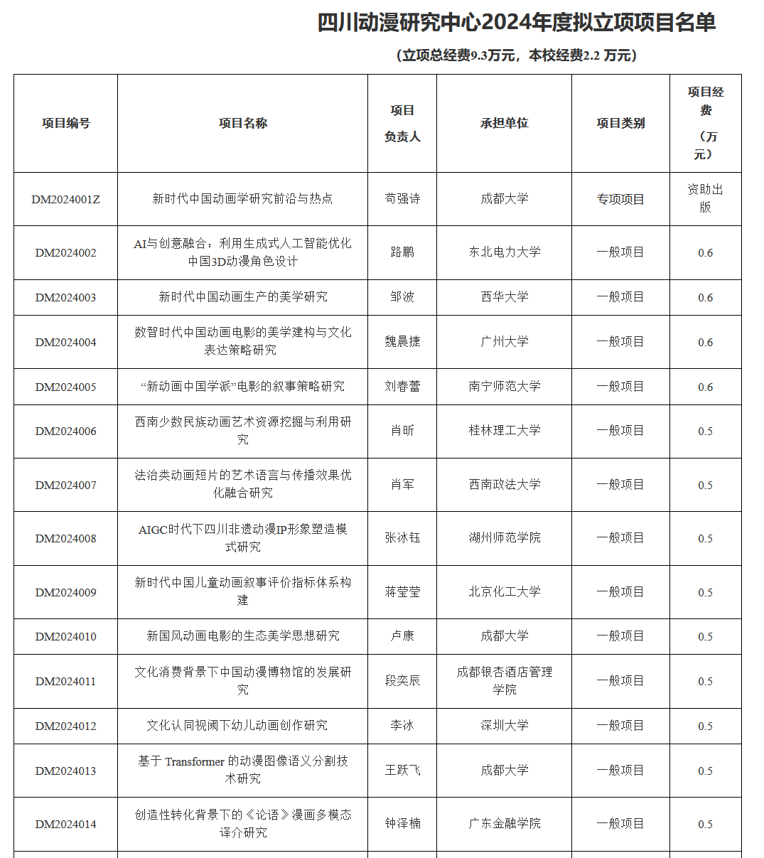 四川动漫研究中心的评审工作经过了“单位审核推荐”、“专家分组评议”和“中心审核”三个阶段的严格审核,确保了立项项目的质量和创新性。本年度拟立项的项目总数为25个,涵盖了专项项目、一般项目、自筹项目以及研究生专项项目等多个类别。 钟泽楠老师的成功立项,体现了广东金融学院国产欧美日韩在线观看在学术研究和文化传承方面的努力与成就。学院将继续支持教师参与高水平的科研项目,以促进学术研究与文化创新的进一步发展。