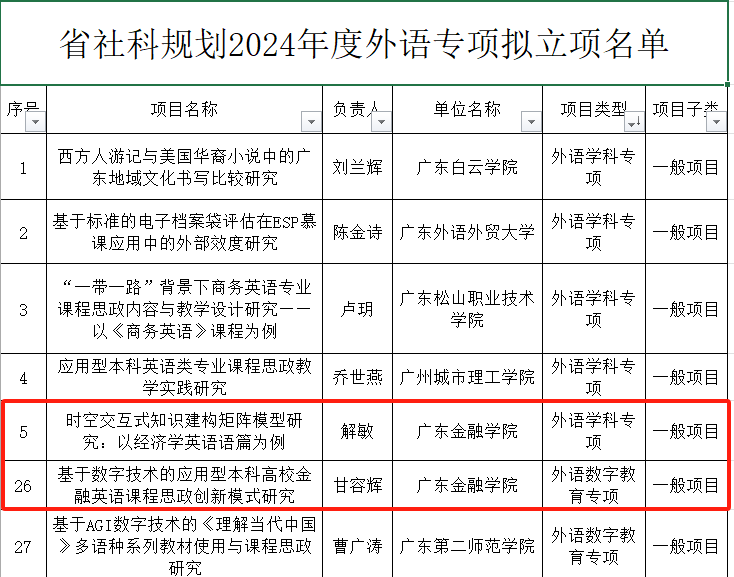 两项立项不仅展现了广东金融学院外文学院在外语教学与研究方面的深厚实力,也为学院未来的发展注入了新的动力。学院师生对此表示热烈祝贺,并期待两位教授的项目能够取得丰硕成果,为外语教育事业做出更大贡献。