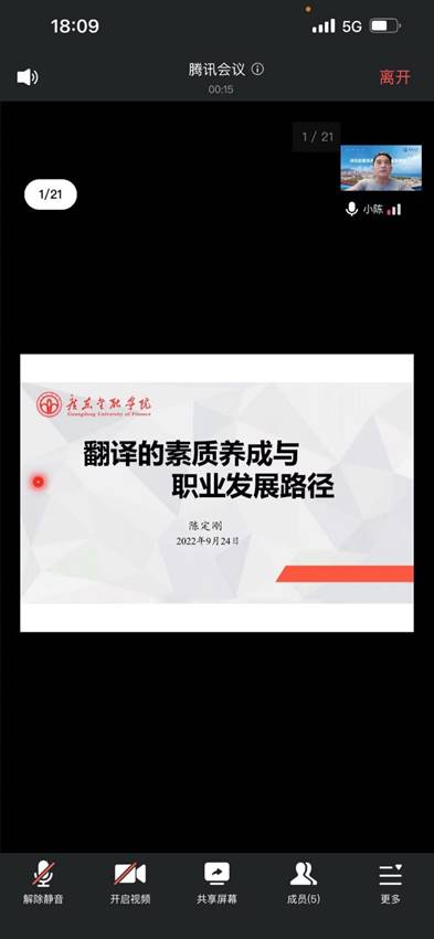9月24日晚,我院翻译系陈定刚博士、译审应邀为烟台大学外国语学院作题为“翻译的素质养成与职业发展路径”的在线讲座。这是陈博士受聘为该校MTI兼职硕导之后的首场讲座。讲座由外国语学院裴院长致欢迎辞,于主任主持。