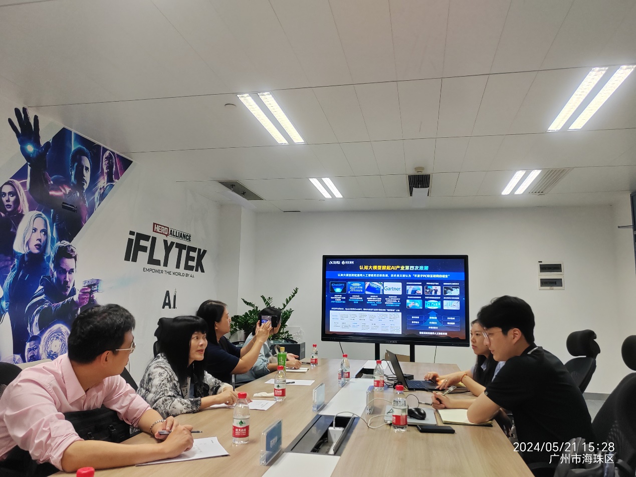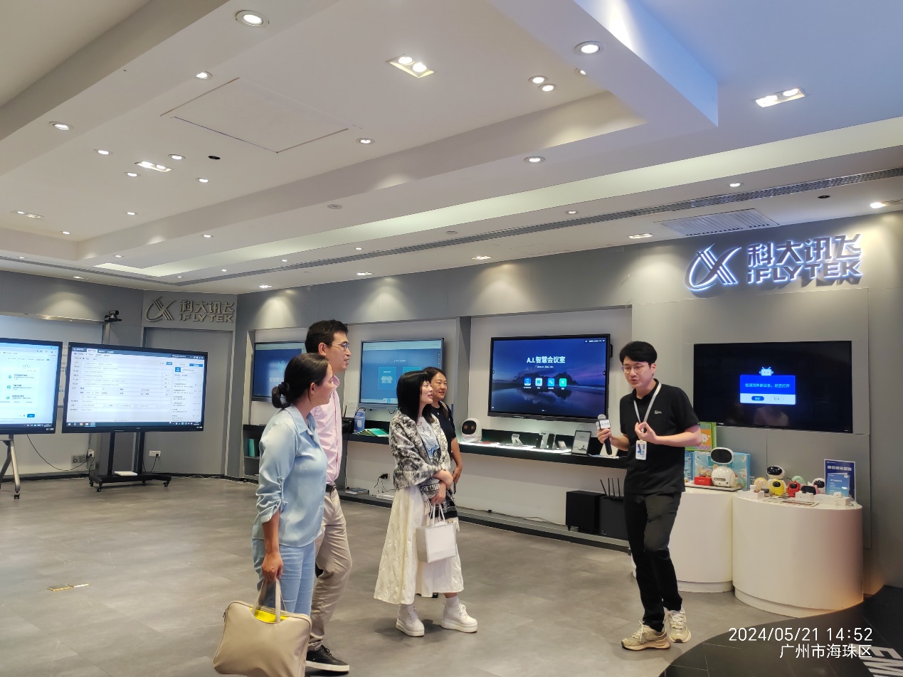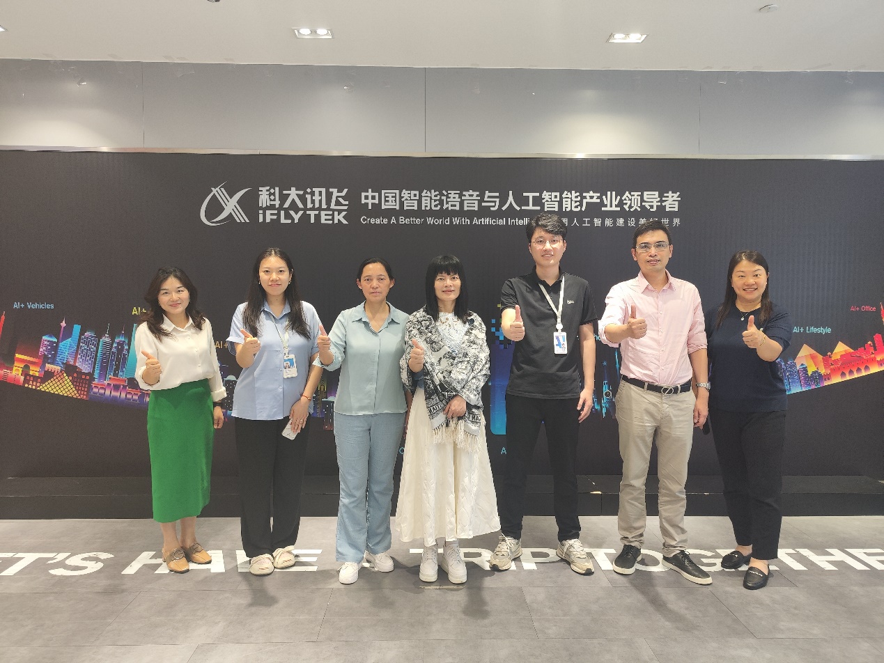 为加强学院与企业间的交流与合作,探索产教融合新模式,为学生提供更多实践机会,促进学生高质量就业,共同推动外语教育与人工智能技术的融合发展。5月21日下午,广东金融学院国产欧美日韩在线观看涂兵兰院长率领导班子一行访问科大讯飞华南有限公司国际媒体港总部,进行了一次深入的访企拓岗活动。本次访问团由涂兵兰院长、甘容辉副院长、陈树坤副院长、英语系主任毕亚男以及翻译系主任邓薇组成,科大讯飞高教行业高级客户经理张宇哲和高级咨询经理莫宇热情接待。