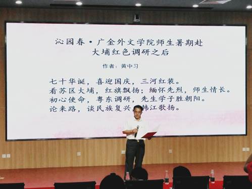 黄中习朗诵了他的诗作《沁园春·广金外文院师生暑期赴大埔红色调研之后》。院长的诗华美壮丽,当院长以慷慨激昂的语调,洪亮如钟的声音演绎出来时,在座的每一个人都被深深感染了。