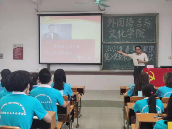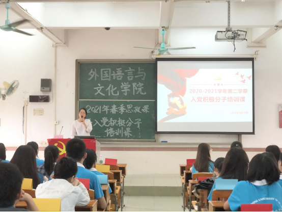 为了使入党积极分子深入学习领会习近平总书记在党史学习教育动员大会上的重要讲话精神,突出庆祝中国共产党成立100周年,我院党总支书记黄晓莉、副书记黄中习,于2021年3月31日中午在7栋教学楼101、102课室开讲2021年春季党史学习教育融入思政第一课, 2018、2019和2020级全体入党积极分子参加了听课。