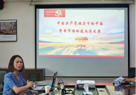 为响应党史学习教育号召,将党史学习教育贯彻到每一位党员,2021年6月4日下午,外文学院邀请党史团成员、人事处处长初可佳教授做主题为“中国共产党领导下的中国资本市场的建立与发展”的党史学习教育宣讲。会议由黄晓莉书记主持,出席会议的有黄中习院长,何承栋副书记,孙智慧、涂兵兰副院长,部分党员老师及学生代表约50人参加了宣讲学习。