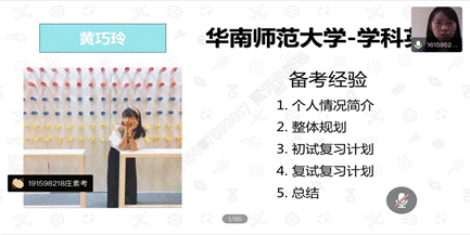 其次是考取华南师范大学学科教学专业的黄巧玲同学。黄巧玲同学从自身经历出发,建议考研学子们首先要制定详细的复习计划,采取适合自己的方式学习,自己多多摸索,也可以多关注相关网络平台,吸取经验。最后,她鼓励所有梦想考研的人,坚持不懈,不要放弃,临大事而不乱,能自胜必自强!