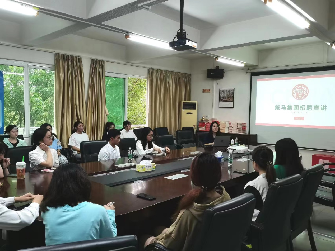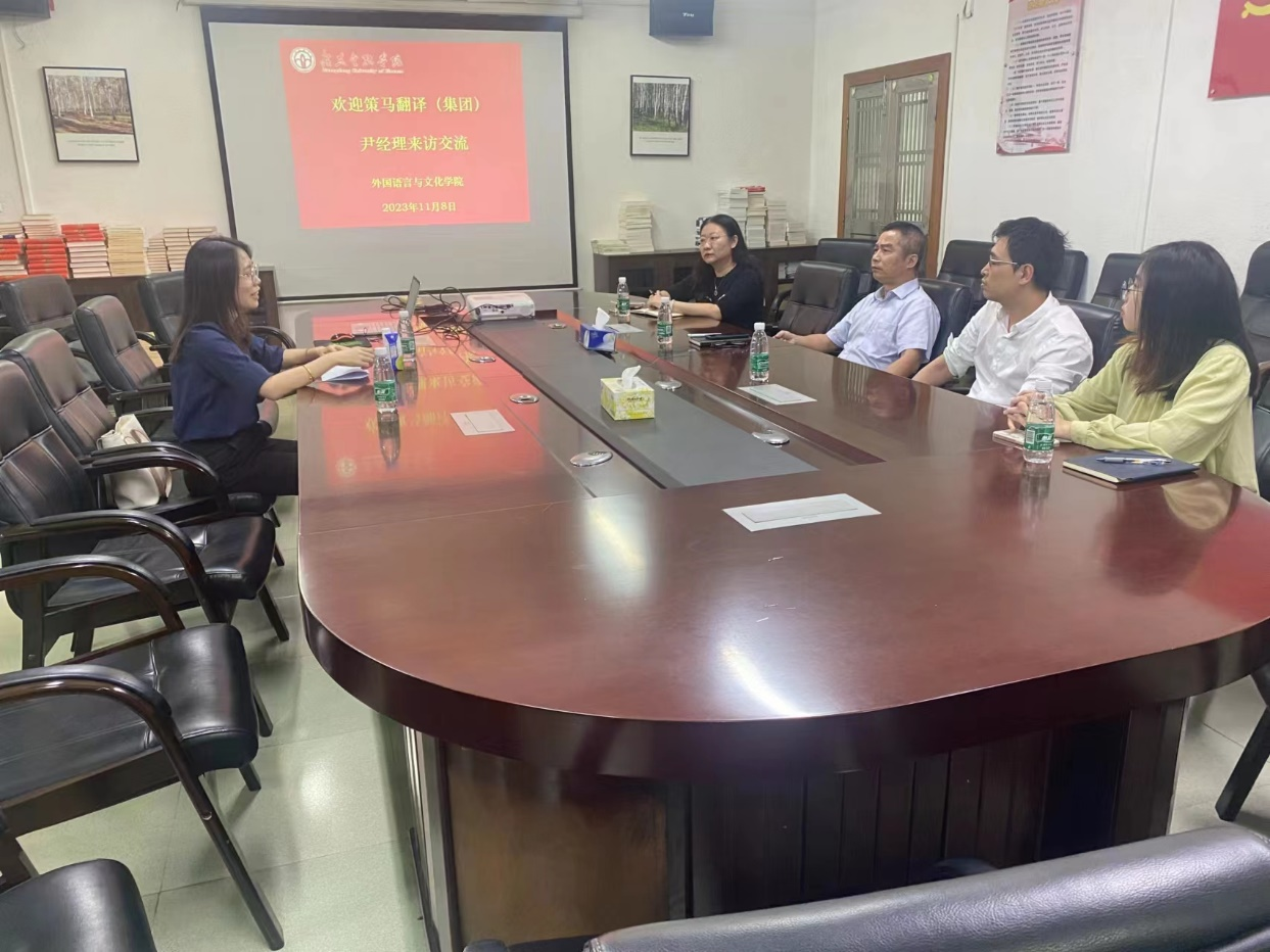 座谈会上,黄庆雄书记和陈树坤副院长分别介绍了学院的学科建设、师资力量和人才培养方向以及学院对翻译人才、师资培养的一系列举措和相关需求。黄庆雄书记表示,希望与策马集团建立多层次的校企合作,在实现人才协育的同时,双方共享共赢发展。策马集团尹利珍总监对外文学院的翻译人才培养理念表示高度认可,并介绍了策马集团发展历程以及集团的翻译和培训业务。她表示,策马愿发挥自身所长,为外文学院的同学们创造实习、实践机会,与学院一道共同培养优质的专业人才。随后,尹总监向我院2024届毕业生就毕业招聘过程中的有关问题进行宣讲。