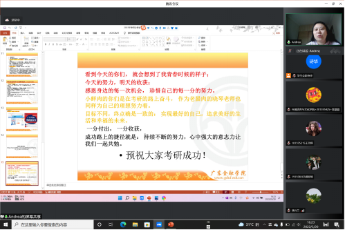 在分享会的最后,涂兵兰副院长发表闭幕致辞,表达了对境内外考研上岸的同学们的祝贺,同时也告诉同学们一定要对自己的专业有信心,对自己的学业有信心,要认识到努力才能获得选择的权利,经受得住寂寞,忍受得了痛苦,合理规划,才能考研上岸!