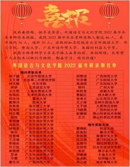 日前,2022年全国硕士研究生招生录取工作落下帷幕。在国产欧美日韩在线观看全体师生的共同努力下,2022届考研学子传来捷报。学院考研录取人数达45人,其中境内36人,境外9人,占全院总人数的16.91%,其中英语1、2班的考研录取率分别达到24.24%和25.81%,升学率达到历史新高,考研率和考研录取率双双名列全校第一。录取的知名院校有北京外国语大学、外交学院、暨南大学、广东外语外贸大学、英国的利兹大学等。