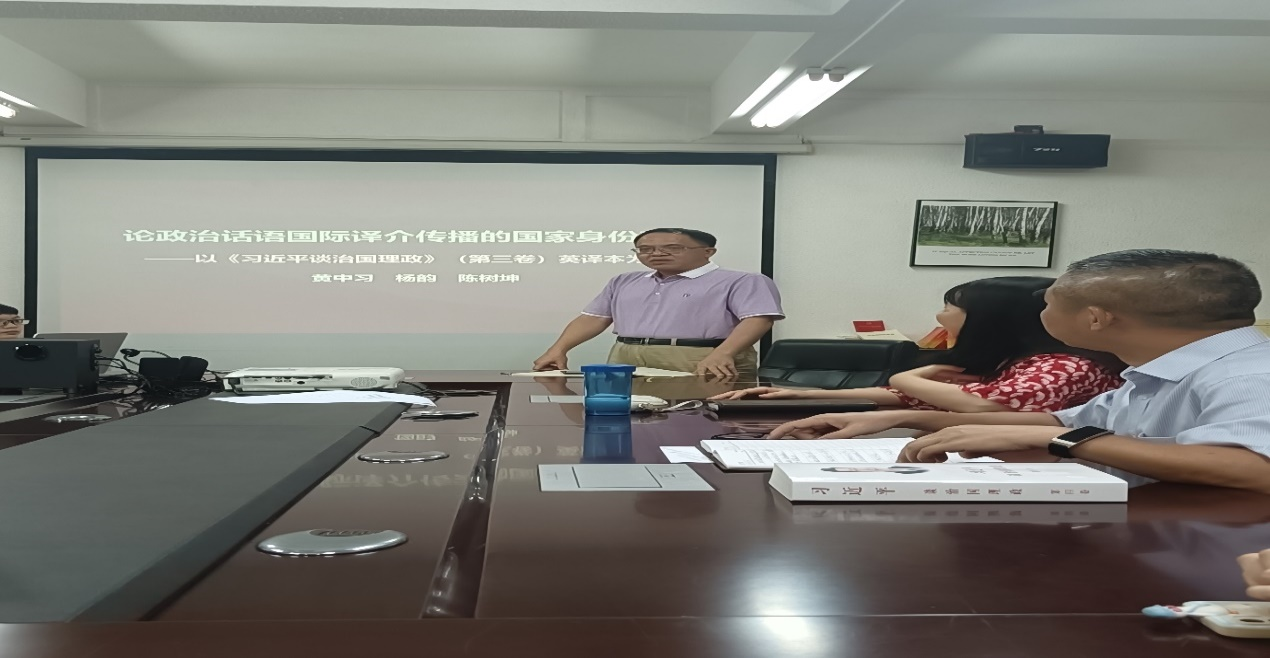 会议伊始,黄中习教授分享了团队最新研究成果,指出《习近平谈治国理政》第一至第四卷及其英译本向世界展示了中国负责任大国的国家形象,促进了我国对外话语体系的高质量建设。同时,鼓励外文学院学子发挥专业特长,着力讲好中国故事,地道传播中国好声音。陈树坤副院长结合新近发表的科研成果,介绍了政策话语分析的研究视角,激发了与会师生的研讨热情。