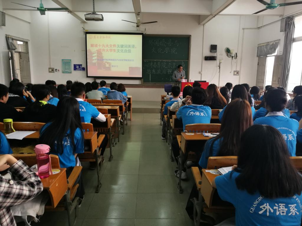 课堂上,黄晓莉书记以“坚定理想信念,践行社会主义核心价值观”为主题开讲,她通过阐述党员先进性的含义,带领同学们感知其重要性,在践行社会主义核心价值观的同时,要发挥党员的先进性和先锋模范作用。黄中习院长则围绕“解读十九大文件关键词英译,提升大学文化自信”开讲,让同学们在愉悦的氛围中加深了对十九大文件的认识、明白到自身努力的必要性,告诉大家应当关注国家社会的发展。
