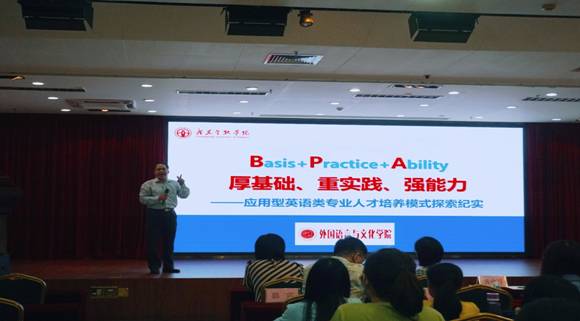 孙智慧副院长详细解读了广金融-广轻工协同培养的商务英语专业本科班的人才培养方案,介绍了专业课程设置与教学要求,从外语专长、人文素养、国际视野、中国情怀和校本特色五个方面向同学们讲解了课程设置的目的,着重强调全体学生一定要学好外语专长,要逐步提高专业的新台阶。