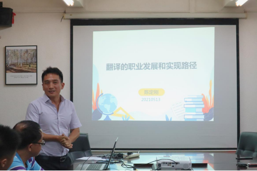 随后,陈定刚博士就翻译职业发展与实现路径分享了自己的经验,他引用了乔布斯“连点成线”这句名言来展开自己的经验分享,将翻译职业发展分为了三个阶段:学习阶段、职业阶段、事业阶段。在学习阶段打好翻译的基础,在职业阶段研究所在行业的翻译理论,在事业阶段选择自己热爱的行业继续钻研。同时,陈博士也表示教辅书并不能满足庞大的翻译体系,同学们平时可以将学习当成生活的一部分,主动走进生活,长期坚持,成果将会是令人期待的。