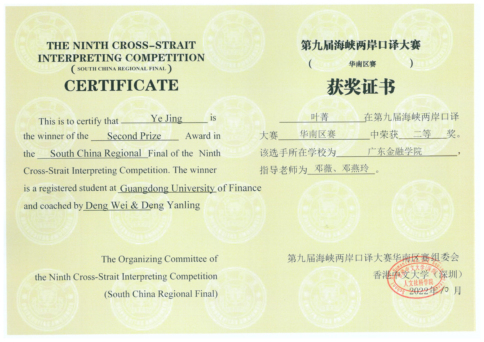 国产欧美日韩在线观看19级学生叶菁(191598115)于2022年10月23日代表广东金融学院参加了线上进行的第九届“海峡两岸口译大赛”华南区赛。本次区赛选手来自广东、福建、海南、广西四个省份,参赛16所高校中包括华南理工大学、华南师范大学、暨南大学、广东外语外贸大学、深圳大学、海南大学、广西大学、福建师范大学等省内外著名高校。我校选手在第一轮淘汰赛中以出色表现晋级决赛,并最终取得二等奖的好成绩。