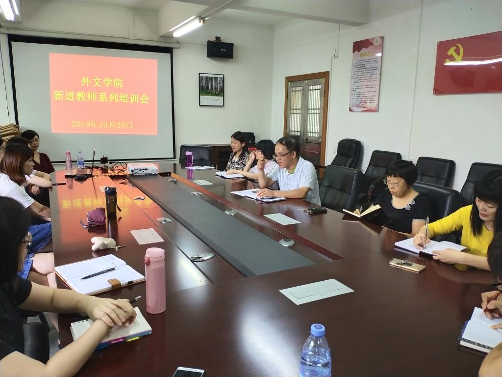 2019年10月23日中午,外文学院组织本年度新进教师就本科教学审核评估工作注意事项进行了集中培训。培训会议由黄中习院长主持。黄院长首先传达了学校迎评工作的相关文件精神,强调课堂教学的重要性,鼓励新进教师尽快适应工作环境,多向同事学习,常与学生交流,在持续改进中练好教学基本功。