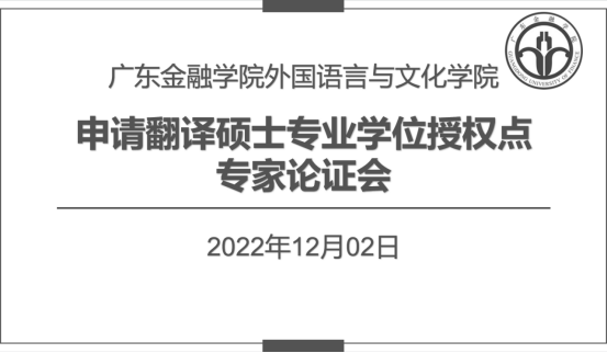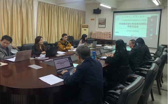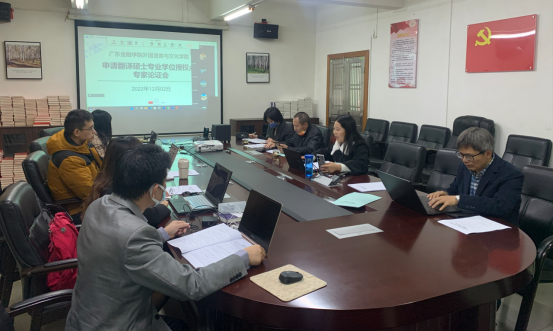 2022年12月2日上午,我院举行申请翻译硕士(MTI)专业学位授权点专家论证会。学院邀请到中山大学王东风教授、广东外语外贸大学赵军峰教授、广州大学肖坤学教授以及我校校长雍和明教授,通过在线会议的方式,对申硕工作小组此前形成的申报材料“会诊”“把脉”,同时也邀请到我校研究生处卿前龙处长、郭丽梅副处长和陈晓莉老师莅临学院会议室作线下指导。