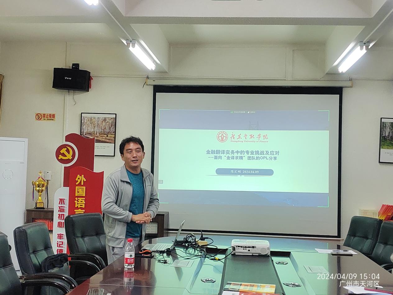 在会议的核心环节,各位嘉宾依次发言。陈树坤副院长探讨了基于语料库与人工智能的翻译研究与实践,为中心的学术研究提供了新的思路。陈定刚译审作为行业专家,分享了金融翻译实务中的专业挑战及应对策略,使同学们对实际工作中的问题有了更清晰的认识。邓燕玲老师则从口译实践的角度,介绍了常见类型及市场动态,为同学们的职业发展提供了有益的指导。