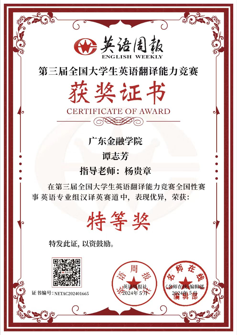 第三届全国大学生英语翻译能力竞赛已落下帷幕,竞赛吸引数十万余全国学子集聚参赛。经激烈角逐,广东金融学院国产欧美日韩在线观看谭志芳同学(学号221598119)以其卓越的英汉互译能力,暂获英语专业组汉译英赛道特等奖(第三名)和英译汉赛道二等奖,喜获特等奖奖金二百元,为广东金融学院增添了光彩。