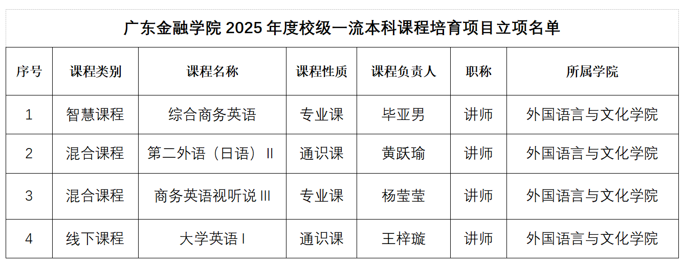 为贯彻落实广东省教育厅《2025年本科教育教学工作要点》精神,推动课程建设高质量发展,我校近期组织开展了2025年校级一流本科课程培育工作。经学院推荐、学校严格评审,国产欧美日韩在线观看申报的《综合商务英语》《第二外语(日语)Ⅱ》《商务英语视听说III》《大学英语I》四门课程成功获批立项,涵盖智慧课程、线上线下混合式课程及线下课程三大类型。此次立项充分展现了外文学院在"新文科"建设背景下课程改革的显著成效,为培养具有国际视野、跨文化交际能力和专业素养的外语人才提供了有力支撑。