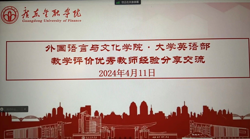 2024年4月11日晚8:00,我院大学英语部举行“教学评价优秀教师经验分享在线交流会”。在2023-2024学年第一学期获得教学评价优秀等级的大学英语老师:朱冰霞、甘容辉、陈定刚、林小惠、梁霏、温荣芬、庄宇梅、李海燕先后分享了各自在课程教学管理、课程教学设计、教学内容拓展、学生评价考核、教学APP使用等的经验。