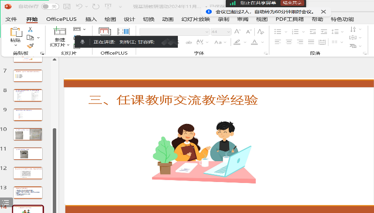 在随后的任课教师教学经验分享环节,任课教师们踊跃发言,分享了各自的教学实践经验。他们通过集体备课、共同制作课件,确保了教学内容的科学性和系统性。为帮助学生掌握图表作文技巧,教师们还精心准备了纸质和数字版资料供学生背诵记忆。同时,老师们利用学习通、QQ群等平台,分享了大量学习资源,特别是往年的真题及解析,为学生备考提供了有力支撑。此外,教师们还通过发布时事新闻词汇测试、批改网布置作文等方式,开展智慧教学与管理。