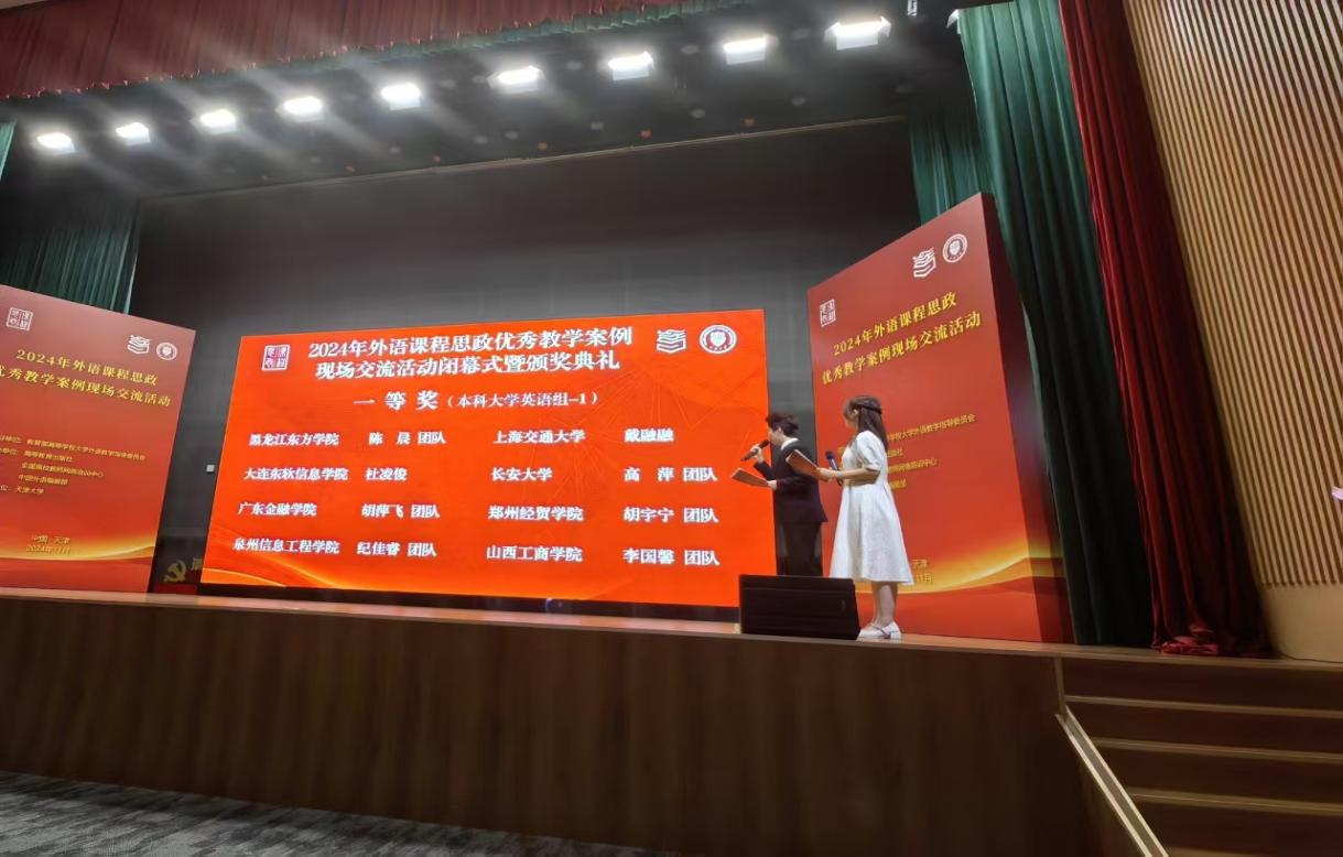 2024年11月16日,外文学院大学英语教学部的胡萍飞、温荣芬、甘容辉、曲敏和翁佳炀五位教师组成的参赛团队,凭借其卓越的教学风采和深厚的理论功底,在众多参赛团队中脱颖而出,荣获本科大学英语组全国一等奖的好成绩。比赛现场随机抽取教学素材,通过说课阐述和问答两个环节进行教学展示,深入挖掘教学素材中的思政教育精髓,实现外语教学与思政教育多角度、深层次的创新融合,彰显了教学风采。