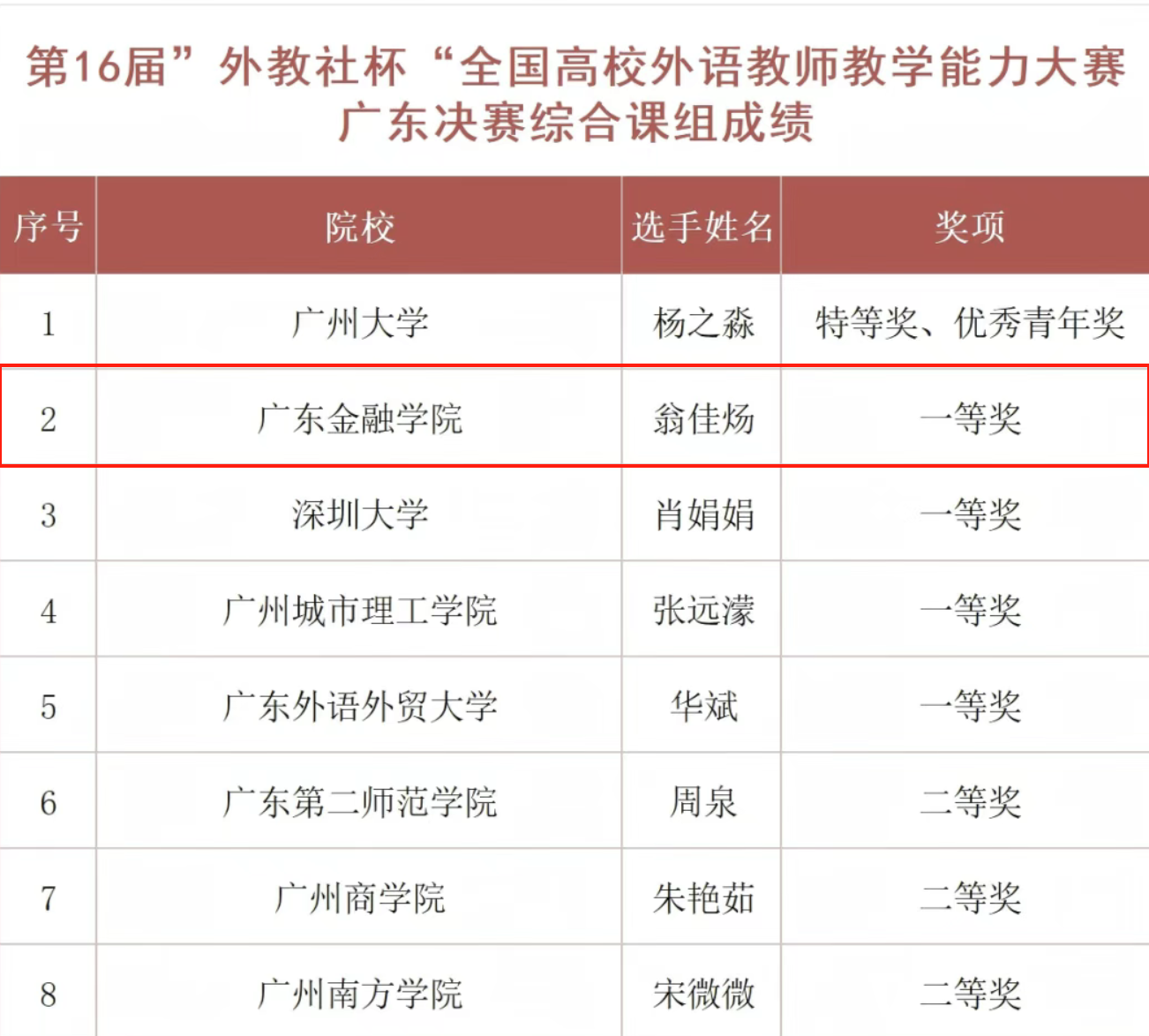 6月7日,第十六届“外教社杯”全国高校外语教师教学能力大赛(大学英语组)广东赛区决赛暨颁奖典礼在广州南方学院圆满落幕。广东金融学院国产欧美日韩在线观看翁佳炀老师凭借扎实的教学功底与创新的教学设计,在综合课组激烈角逐中脱颖而出,勇夺综合课组一等奖第一名,为学校再添殊荣。